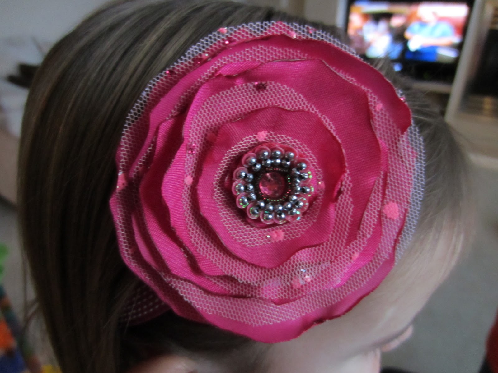 Earlier today Little Miss C and I made these two flowers and sewed them onto "Goodie" brand hairbands. I love this brand as little Miss C has long, very fine hair and they never slide out. They have little ridges that hold tight