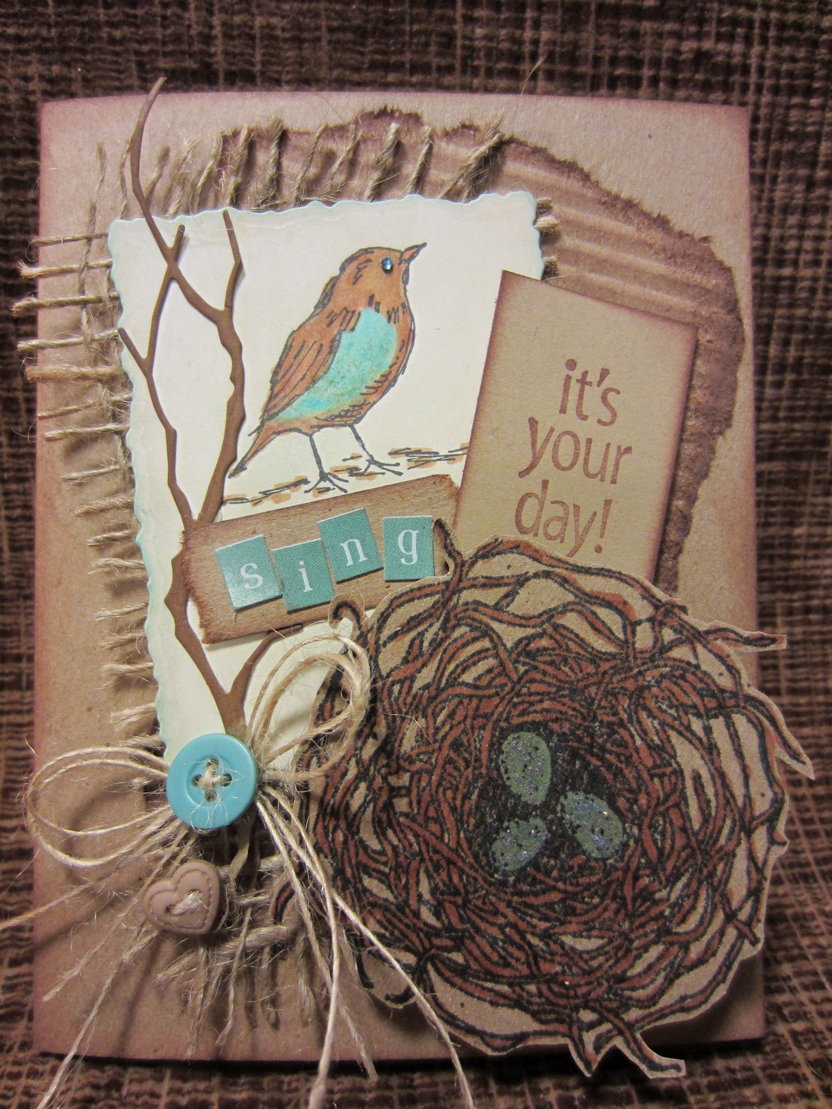 This is totally a card made from my stash. The corrugated cardboard is from the sleeve on my coffee drink at Starbucks earlier today, the jute is from a roll of ribbon I bought at the scrapbook store a couple of years ago. It is the first time I have used this jute ribbon...I think I am hooked on it now. The buttons, jute twine and card stock are from my stash and I have had them for at least 5 years. I even had the little "It's your day!" phrase leftover from another card project I did last summer.