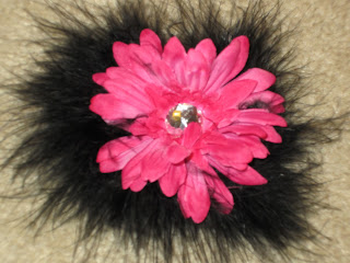 I popped into Michaels today and found that lovely white boa...it has the added bonus of some silver threads running through it. I grabbed the black as well...too bad it doesn't come with silver threads too. I had the black polka dot flowers already and added in some white petals from my scrapbook stash. I always have an assortment of hair clips and goodie brand elastics. These should work out just right for the fasteners for the first few. I will keep my eyes peeled for the specific type that is on the flower Miss C already owns.