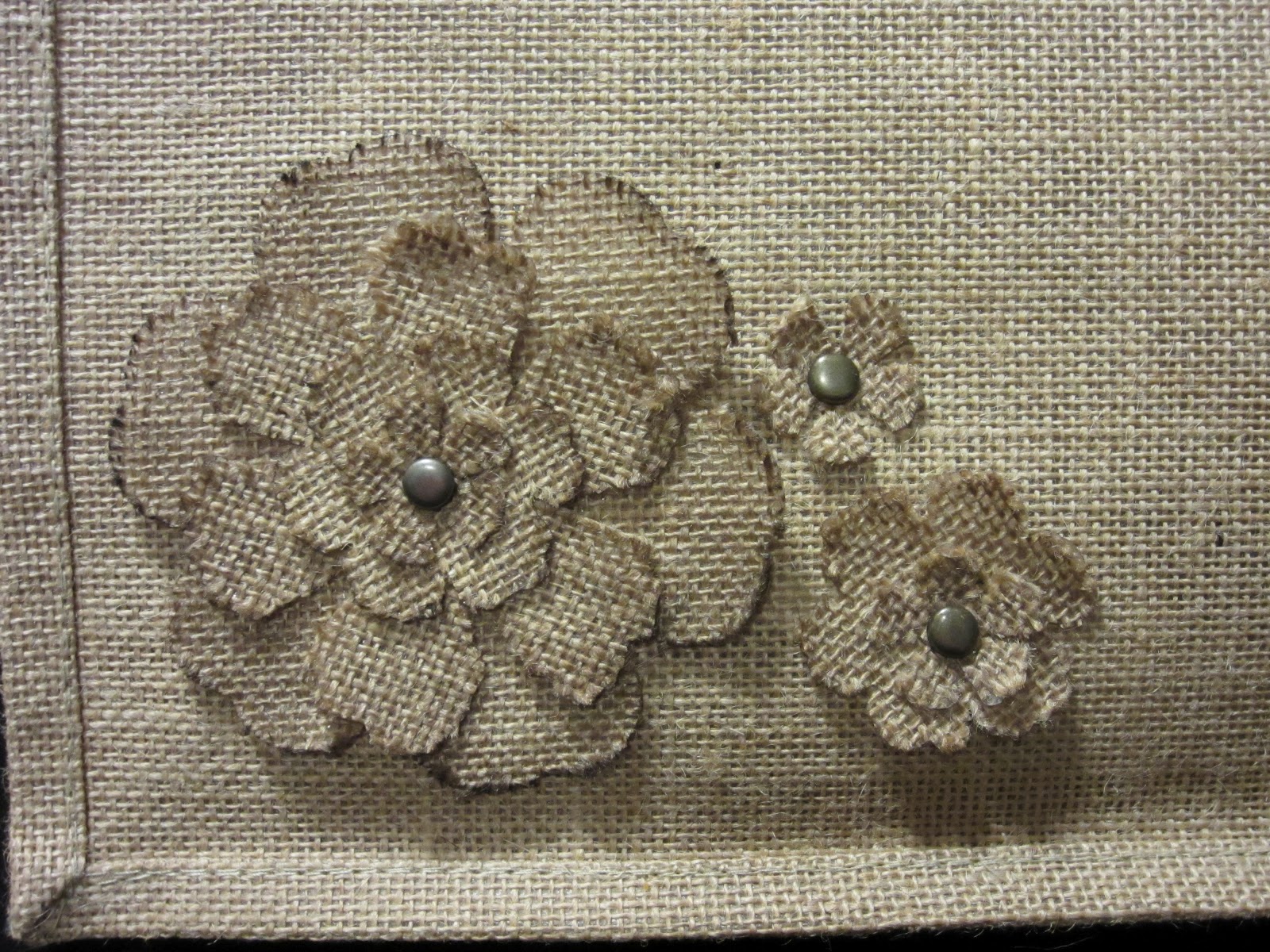 These are burlap flowers that I cut out of a shopping bag from the dollar store. A couple of days ago, I blogged about the bag I made to carry my weigh in clothes, diet sheets, diet grocery shopping book, etc.