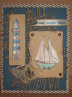 What a fabulous card, I love that blue for the seafaring theme and the cheese cloth with the anchor is a fabulous touch! The ship and lighthouse are wonderfully done!