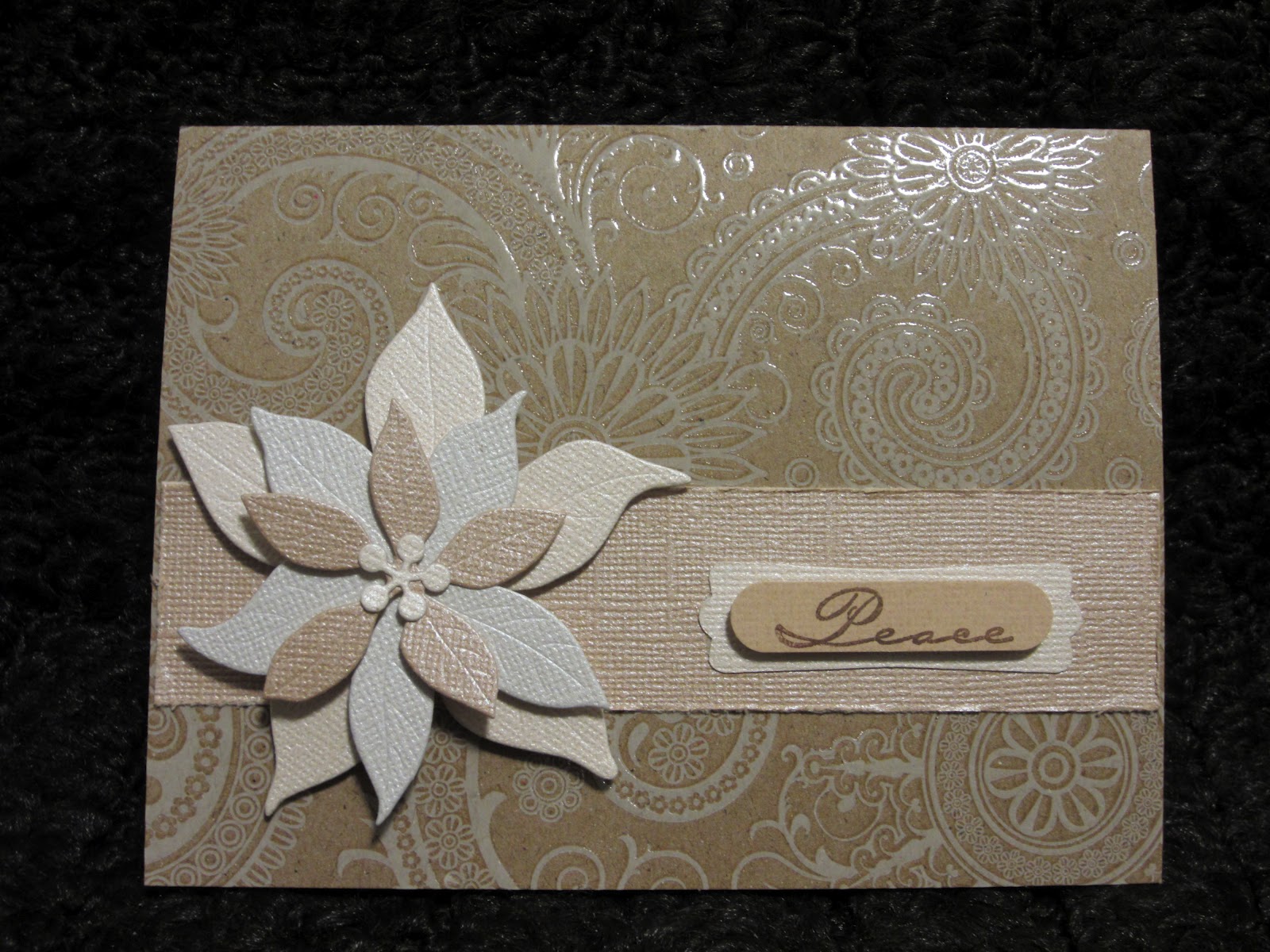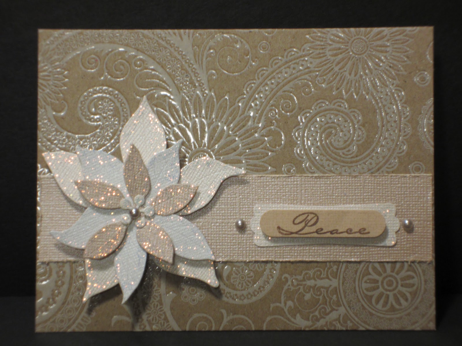 I like to keep my poinsettias to cards and those found in silk flower arrangements. In that spirit, here is my lastest Christmas card creation. My poinsettia is a new tricoloured hybrid, all glimmery in kraft, taupe and ivory. I used one of the shiny card bases that I mentioned in my last post. I don't mind this box of bases as the sheen is sort of embossed over the kraft and is not too offensive.