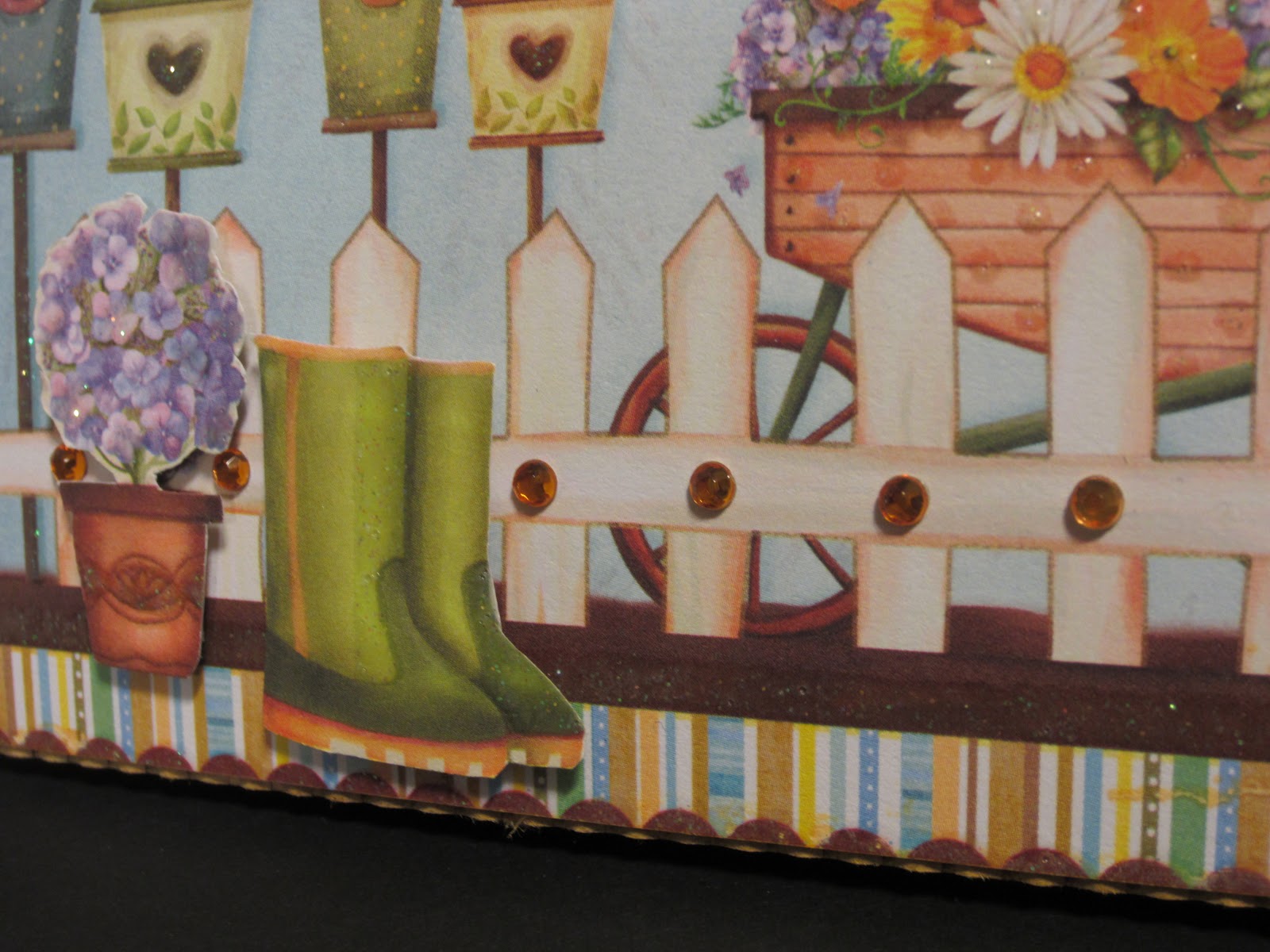 The glittered designer paper of the birdhouses and fence was trimmed from a 12 inch page to fit the card and small rust jewels added over the fence nail heads printed on it. Luckily, the bird houses and flowers were shot with glimmery glitter already!