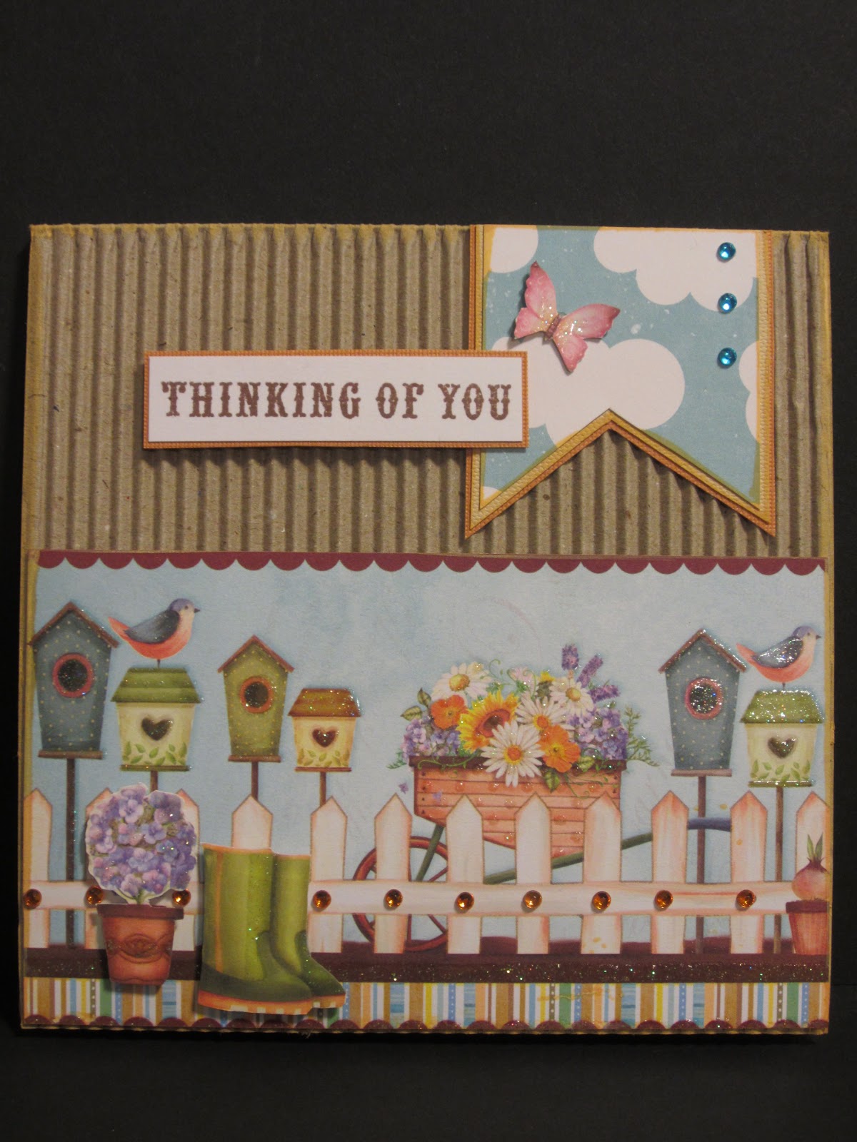 So happy to hear you are feeling better. Your card is lovely, doesn't look 'simple' at all. Your nail heads on the fence were such a great detail, and your handcut gardening boots...neat touch. The corrugated background was perfect for the birdhouse paper. Great job...somebody had a delighted smile when opening this one. TFS