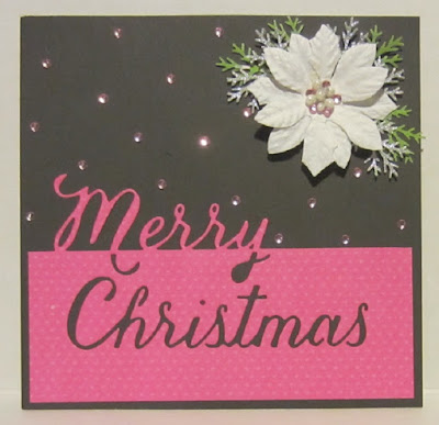 I tried a variety of DP and card behind this die and the only one I liked was this black card. Hope it does not look too stark. I added a large white poinsettia and a few Martha Stewart leafy punch shapes in green and metallic silver. It still seemed too stark so I placed some pink rhinestones here and there to look like twinkling stars, or maybe pink snowflakes! Took a couple of extra pink rhinestones and tucked them around the existing pearls in the flower center.