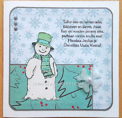 Eemeli of Eemeli's Home as this adorable snowman. I think the blue colour scheme is so soft and pretty! I especially love the wee pop of red in the bottom DP...