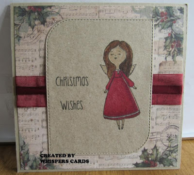 Sam has made us a second lovely card this month! This pretty angel sits on a gorgeous vintage looking DP background. The burgundy sheer  ribbon and what looks to me like a velvet ribbon overlay is so, so pretty.